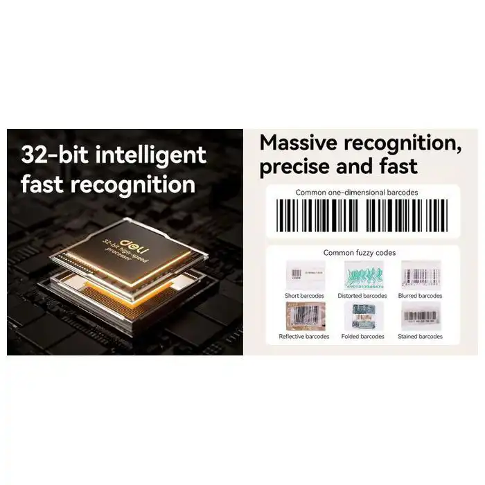 Marque Deli, modèle ES236 Couleur : Noir Taille : 95x100x145 mm. Poids : 238 g. Fonctions exceptionnelles Puce : 32 bits, lecture rapide, traitement rapide Peut lire les codes-barres et les codes QR 1D et 2D Peut être utilisé en continu. Interrupteur marche/arrêt automatique Prise en charge de la technologie CMOS La distance de numérisation prend en charge jusqu’à 1 mètre. Connexion USB, plug and play. Un voyant d’état vous avertit lors de l’utilisation. Angle réglable de 20 degrés. Système de lecture de codes-barres, vitesse maximale de 0,1 seconde Prend en charge une variété de numérisations. Peut scanner des codes-barres froissésProduits dans la boîte Scanner de codes-barres Manuel de montage